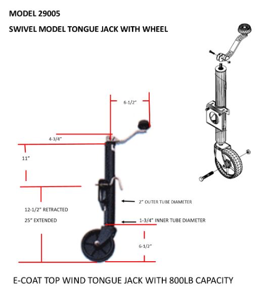 Trailer Tongue Jack; Manual Round Topwind Swivel Jack; 800 Pound Capacity; 12-1/2 Inch; 12-1/2 Inch Retracted x 25 Inch Extended; 11 Inch; E Coated