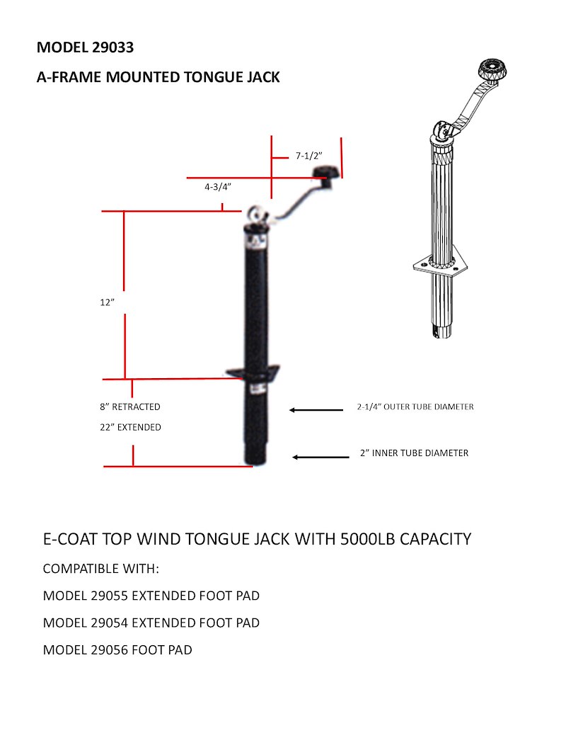Trailer Tongue Jack; Manual A-Frame Round Topwind Jack; 5000 Pound Capacity; 14 Inch; 8 Inch Retracted x 22 Inch Extended; 12 Inch; Bolt-On Mount; E Coated; Retail Box