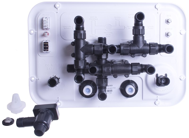 Fresh Water Management System; Nautilus P3; Controls The Fresh Water Supply For Tanks/ Pumps/ Inlets/ Pressure/ Winterinzing; 13-1/2 Inch Width x 8-1/2 Inch Height Cut-Out Opening; Power Fill Fresh Water Tank/ Supply Water To Fixtures From Tank With Pump/ Connect To City Water/ Winterize Plumbing Lines And Bypass Water Heater To Avoid Damage/ Rinse Tanks To Sanitize Or Control Odor/ Connect 3 Coax Lines For Satellite/ Cable/ Auxiliary; White; With Spin Sprayer