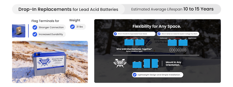 - Rugged Battery Design built for RV, camper van, boat, trolling motor, industrial, off-grid, and residential backup applications