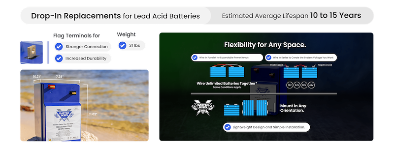 - Rugged Battery Design built for RV, camper van, boat, trolling motor, industrial, off-grid, and residential backup applications