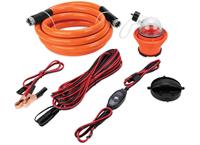 - Includes: (1) pump, (1) 4-in-1 adapter + clear rinse cap w/ hose connector, (1) 15' water hose, (1) power cord w/ on/off switch, (1) power cord extender, (1) 30' power cord w/ clamps, (1) backflow preventer, (1) vented carry bag, & storage caps.