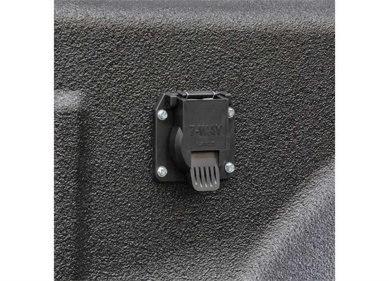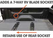 - Routes a 7-way RV blade socket into truck bed while retaining use of rear socket