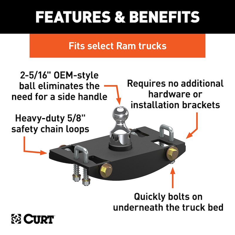To ensure maximum quality, the CURT OEM-style gooseneck hitch for Ram comes with a tough A-coat finish to easily resist rust and scratches, and it is backed with a limited lifetime warranty.