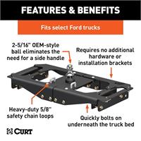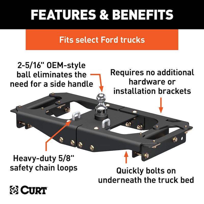 Ingenious design and reliability -- these words don't just describe the Ford Super Duty; they were the inspiration for the CURT OEM-style gooseneck hitch for Ford. This hitch is built to excel in two key things: ease of installation that comes from an ingenious design and safe, reliable towing even with heavy-duty gooseneck trailers.