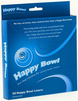 These biodegradable toilet liners are guaranteed to keep your RVs bowl sparkling clean and streak free. Use a Happy Bowl Liner once and youll never use a brush to clean your toilet bowl again. Heres what Heidi Johnson of Tucson, Arizona, had to say about Happy Bowl toilet liners: