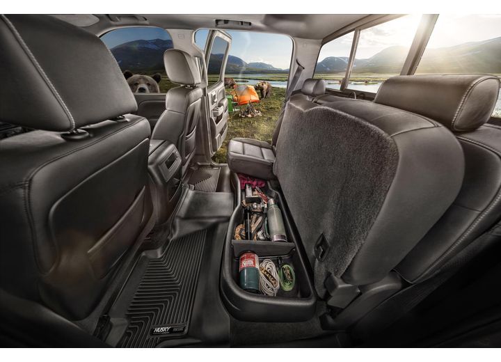 Under Seat Storage Unit; GearBox ®; Under Rear Seat; 1 To 2 Compartments; 13 Inch Length x 61 Inch Width x 8 inch Height; Removable Divider; Black; Plastic
