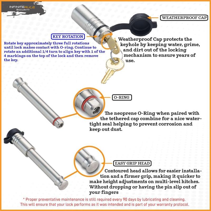 Keep Your Trailer Safe with InfiniteRule's Custom Fit coupler lock. Towing a trailer or equipment? Don't leave it vulnerable to theft with InfiniteRule's custom-designed receiver lock single pack. Specifically engineered to fit Trailer Coupler Lock For 1-7/8", 2", & 2-5/16" Ball, these rugged locks will deter criminals from detaching your valuables. The included machined stainless steel trailer locks are rigorously tested to a heavy-duty 21K LB rating, so you can trust they will withstand attempts to break, cut, or pick them. The tight-fitting weatherproof rubber caps keep out dirt, water, and grime so the locks continue working smoothly. Protecting your investment is our priority. That's why InfiniteRule trailer locks are 100% made in the USA with premium materials that resist rust and corrosion.