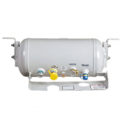 Propane Tank; ASME Permanent Mount Tank; 25 Pounds Capacity; 23 Inch Length x 10 Inch Diameter; Powder Coated; Steel; With Gauge; With L45 POL (Prest-O-Lite) Valve And Channel Brackets; Empty