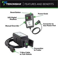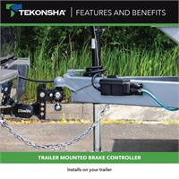 The Tekonsha Prodigy RF is the ideal brake controller for those who tow with multiple vehicles. Rental companies, fleet owners, and those who lease a vehicle are among the many who benefit most from this unique trailer brake controller. With the Prodigy RF, there is no under dash wiring. Instead, the power module mounts to the tongue or front of the trailer and connects to a handheld remote through Bluetooth Wireless Technology. The remote has many of the same great features as other controllers in the Prodigy line, including boost, which allows for different levels of customized braking, manual override to help you brake safely when an unexpected stop pops up, and a digital display that shows proper connection, power output, and continual diagnostics. The remote plugs into a standard 12-volt power accessory adapter and has a five-year limited warranty. The power module has multiple mounting positions. It plugs into the vehicle’s 7-Way connector, offering proportional trailer braking whether you’re driving forward or in reverse. This unique proportional braking system has everything you need to stop safely on the road. The Prodigy RF works with any trailer with up to three (3) axles and comes with all the mounting hardware needed for installation. The power module is backed by a 15-year limited warranty.