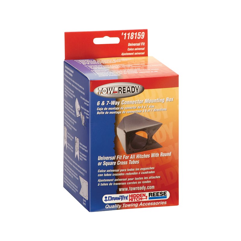 Compatibility: 6 And 7 Way Connector Mounting Box, Round & Square Tube HitchesType: StraightFinish: Powder CoatedColor: BlackMaterial: PlasticMounting Type: Screw-InWith Dust Cover: NoQuantity: SingleWith Mounting Hardware: Yes