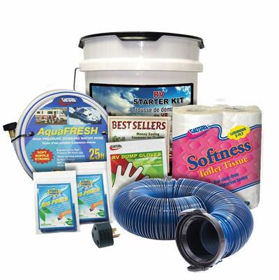 RV Start Up Kit; Starter Bucket Kit For Motorhomes; With 4-Pack Toilet Paper/ 25 Foot Drinking Water Hose/ 30 Amp to 15 Amp Electrical Adapter/ 2 Toilet Treatments/ 10 Foot Drain Hose With Straight Hose Adapter/ Bag Of RV Dump Gloves/ Bucket Compatibility: Starter Bucket Kit For MotorhomesMarine: No